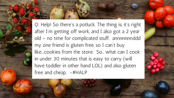 A: Hello there, #HALP! Dude, I FEEL YOUR PAIN. With a crazy schedule, it can be SO hard to get something together in a short time for potlucks. With kids, it’s even harder. A lot of times we can find ourselves just grabbing a bag of chips, or some store-bought cookies, or something ready-made to take, which (don’t get me wrong!) is totally FINE. But, sometimes that means you end up with a lot of the same items and a not-so-exciting potluck selection. Ever been to a potluck where it’s like meat + 40 different desserts? Yeah. So have I.