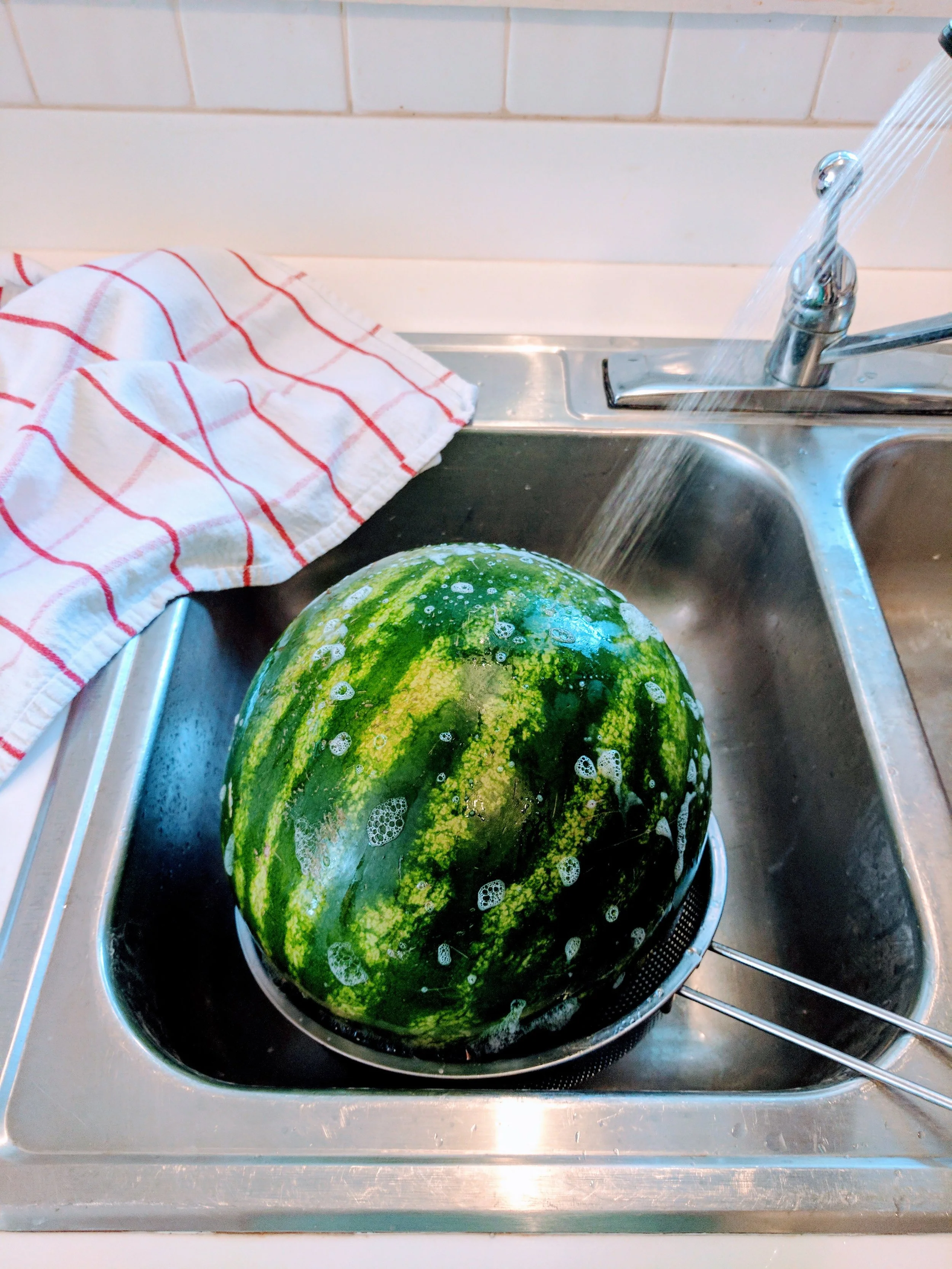 You see, watermelon, being a natural food that grows outdoors, can have little microbial buddies (read: germs that will give you the stomach grip of a lifetime) clinging to the exterior of the melon. If you don’t wash off the outside, you will carry those microbes on your knife through the center of the melon when you cut it. That might not seem like much, but it only takes one bacterium to multiply into literally millions of bacteria in just a few hours.